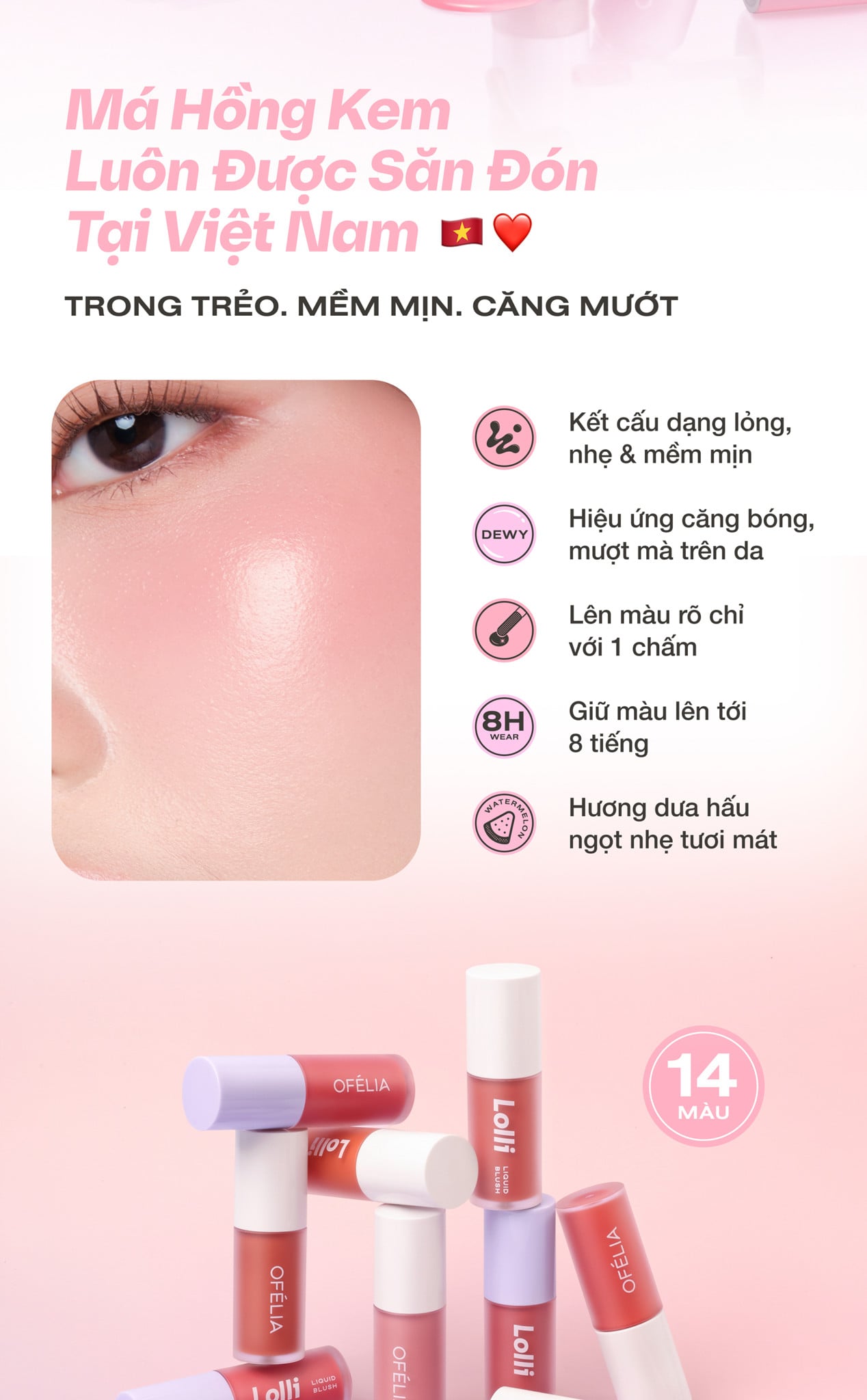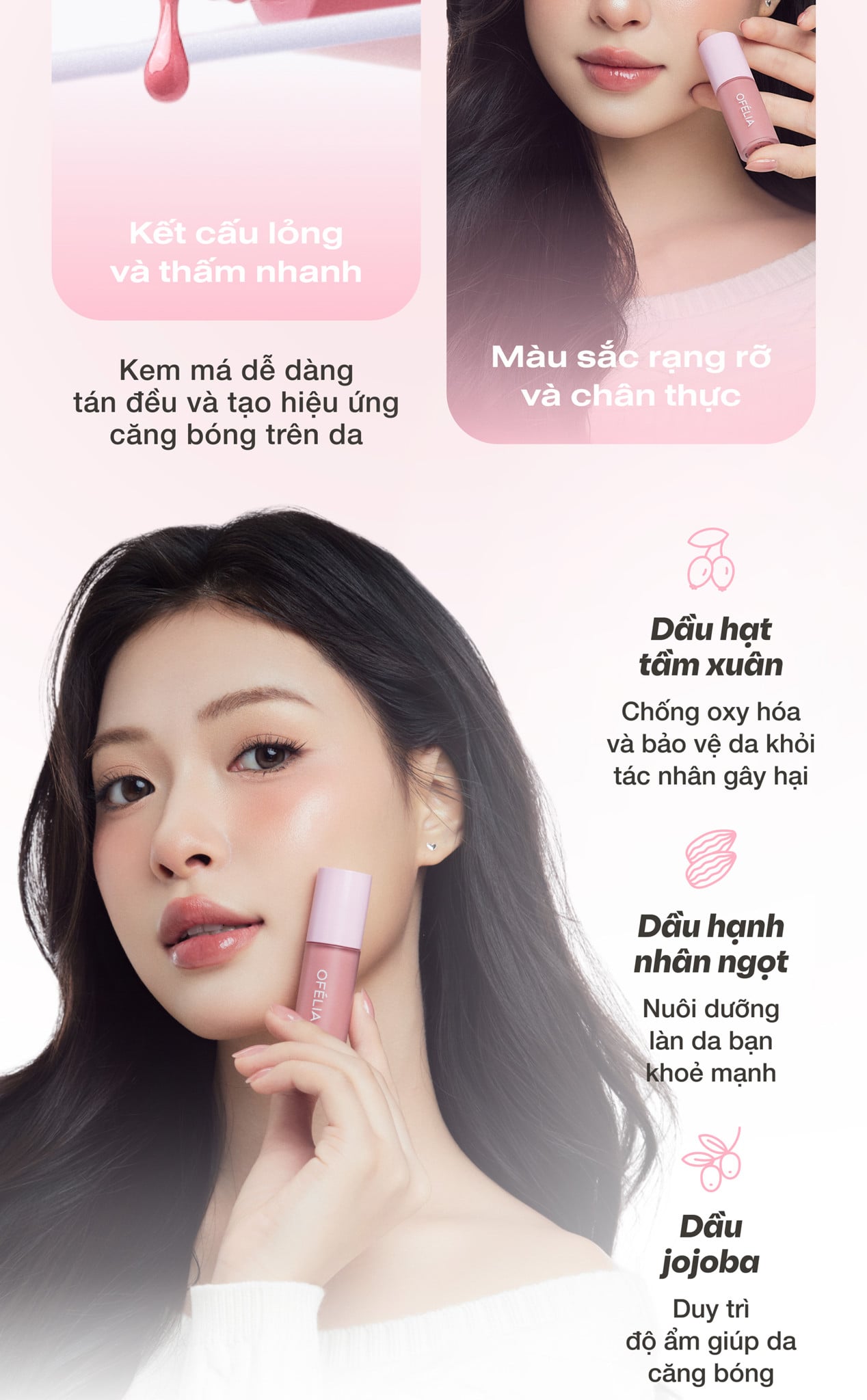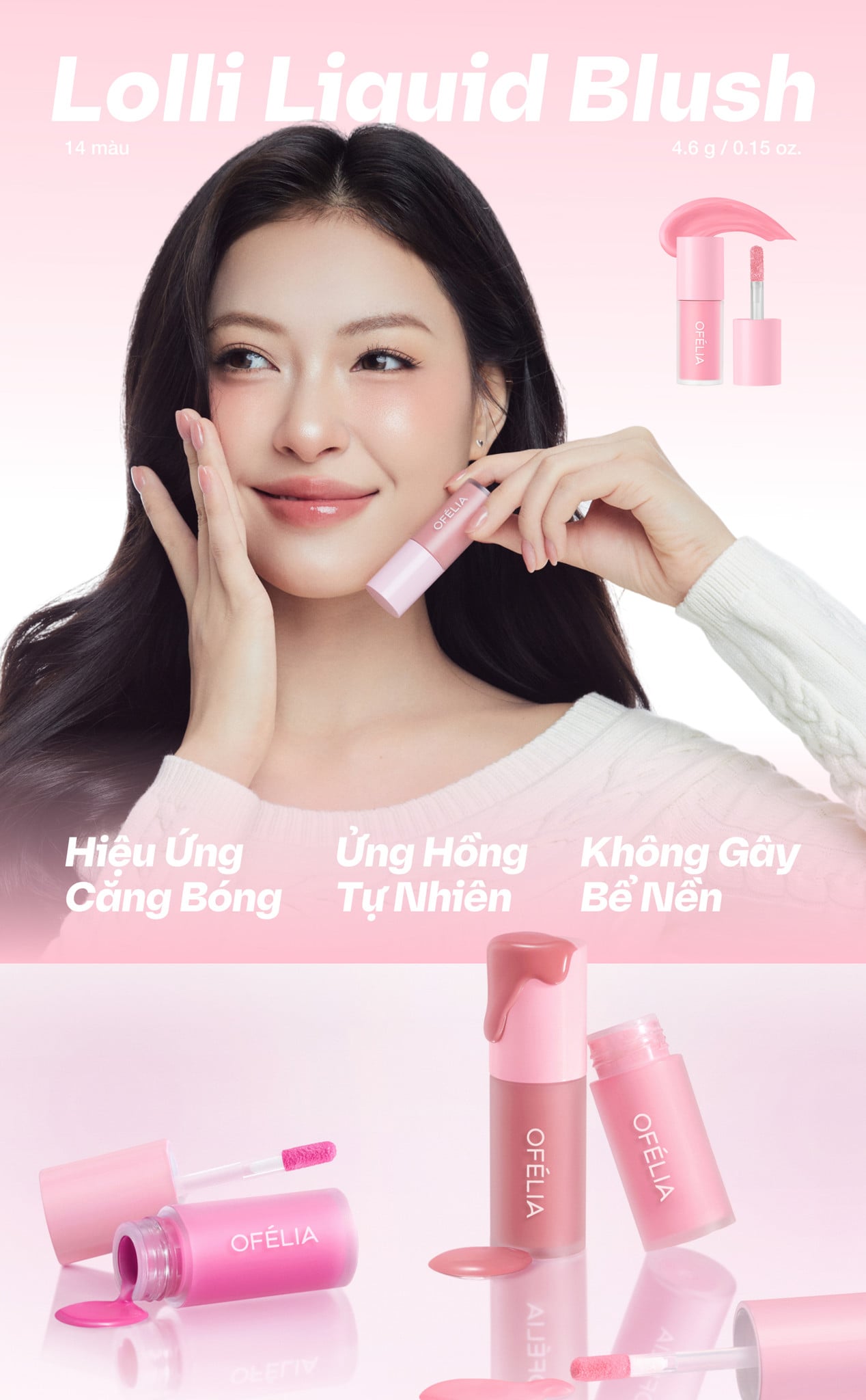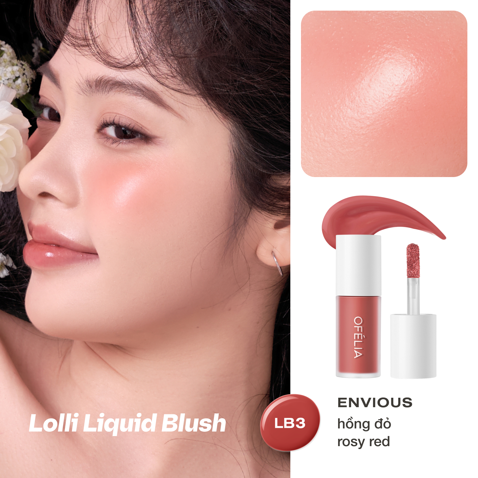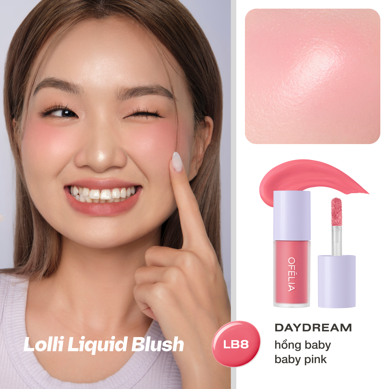 OFÉLIA Lolli Liquid Blush là má hồng có kết cấu dạng kem lỏng, nhẹ và mềm mịn, tạo hiệu ứng trong trẻo cho làn da. Kết cấu nhẹ và lên màu đều, dễ dàng sử dụng, giàu sắc tố và bám vào da tự nhiên, độ bền màu lên đến 12 giờ. Khả năng dưỡng ẩm cao, màu sắc tiệp vào da, cho làn da luôn căng bóng.