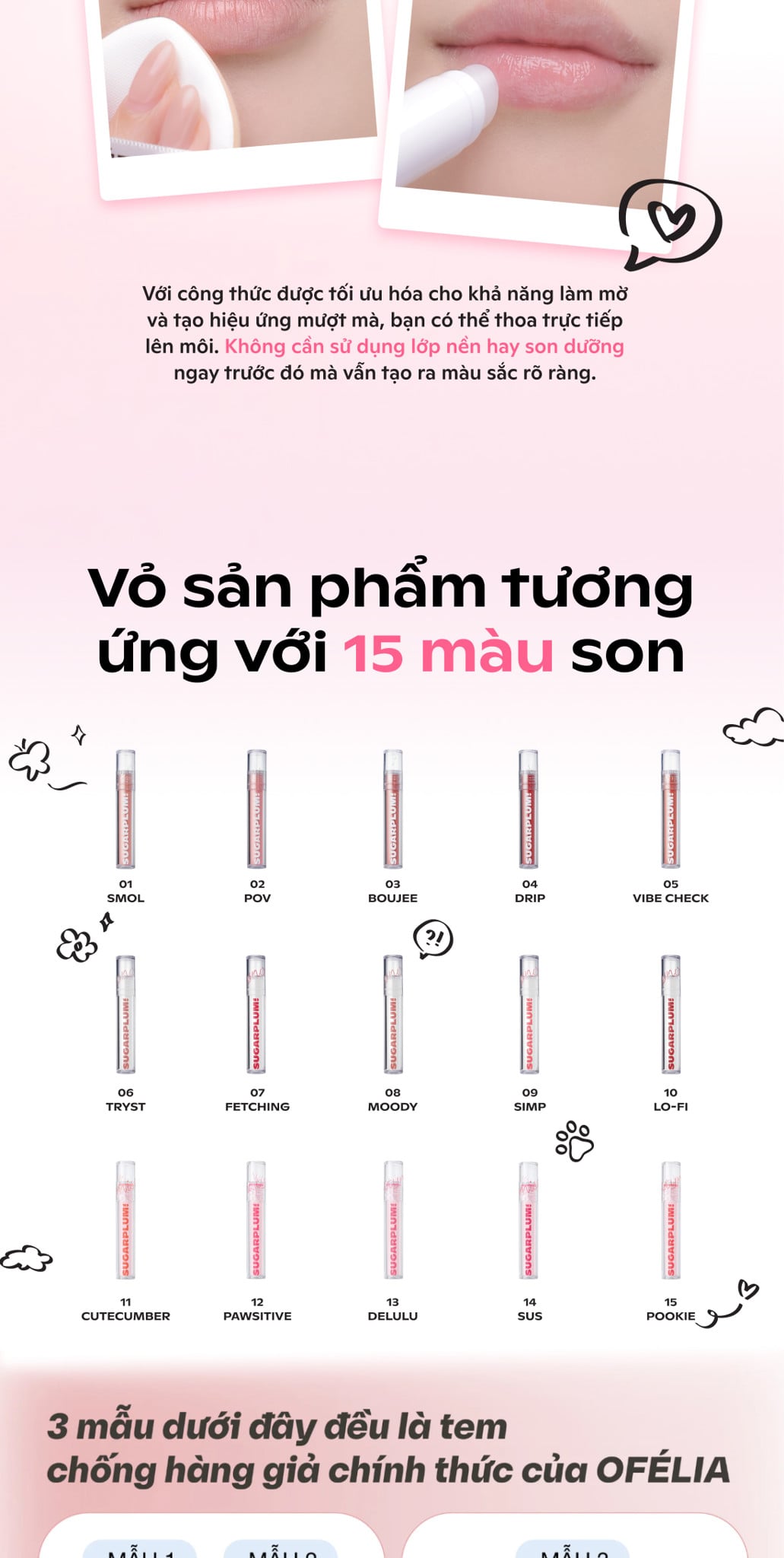 DC&C Group, OFÉLIA và SUGARPLUM không chịu trách nhiệm cho bất kỳ phản ứng cá nhân nào đối với bất kỳ thành phần cụ thể nào. Mô tả sản phẩm trên trang web và mọi kênh truyền thông của chúng tôi bao gồm danh sách đầy đủ các thành phần. Những người có nhạy cảm hoặc dị ứng với bất kỳ thành phần nào được liệt kê không nên sử dụng sản phẩm. Trong trường hợp bạn nghi ngờ hoặc có làn da nhạy cảm, luôn thử nghiệm dị ứng trên một vùng nha nhỏ và nếu bất cứ lúc nào xảy ra kích ứng, ngưng sử dụng sản phẩm.